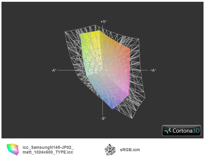 Bei der durchschnittlichen Helligkeit von 223 cd/m² messen wir einen geringen Kontrast von nur 115:1. Fast die gesamte Netbook-Klasse ist mit ähnlich geringen Kontrasten bestückt. In der Farbwahrnehmung äußert sich das in blassen Farben und geringen Farbnuancen. Der Farbraum ist wie zu erwarten weit entfernt von dem, das sich Profis wünschen. Die Angabe der sRGB(t) und AdobeRGB(t) Abdeckung ist jedoch obligatorisch, Profi-Anwender werden kein Netbook einsetzen wollen.