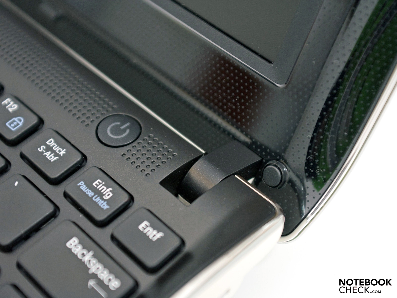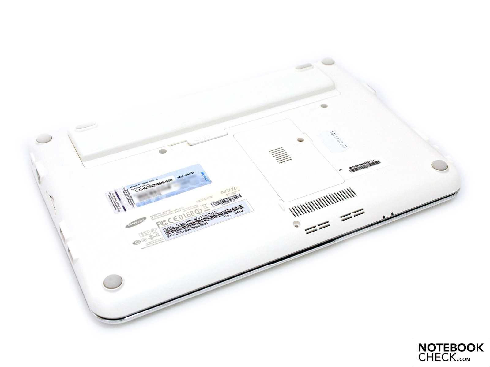 Im Vergleich zum NF310-A01 hat Samsung das Gehäuse nicht verändert und die Verarbeitung sowie die Displayscharniere können überzeugen. Die Stabilität kann durch die flache Frontpartie nicht bei diesem Eindruck anschließen. Ein weiterer Kritikpunkt ist die Aussparung für den mitgeliferten 6-Zellen-Akku. Diese bietet nicht genug Halt und spürbares Spiel ist vorhanden. Bei einem Preis von über 400 Euro könnte man mehr Präzision erwartet.