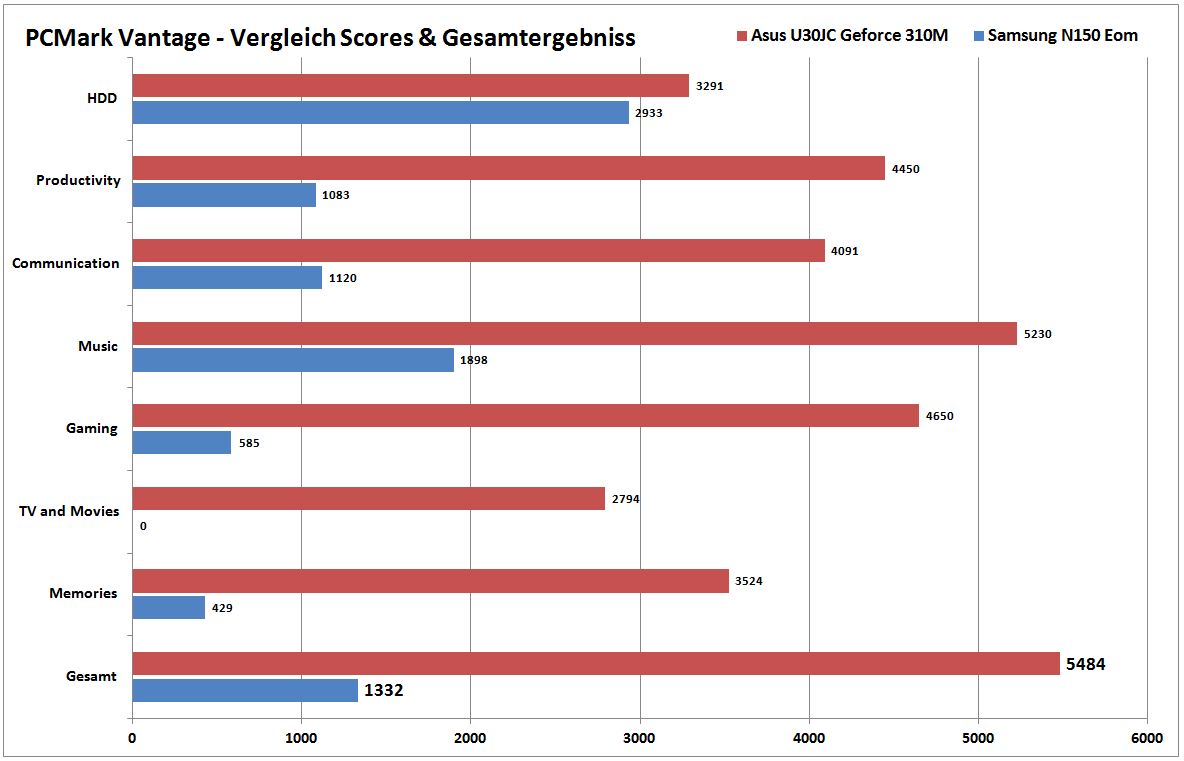 Bei der Leistung holen wir den kleinen mobilen Überflieger auf den Boden der Tatsachen zurück. Der PCMark Vantage ermittelt die Systemperformance und zieht dabei alle Komponenten wie HDD, CPU, GPU, RAM zu Rate. Das N150 kann 1.332 PCMark Vantage Punkte ergattern. Im Vergleich zu einer aktuellen Konfiguration aus Nvidia Geforce 310M und Intel Core i5-430M ist das extrem wenig. Da in Notebooks wie Netbooks dieselben 2.5-Zoll HDDs verbaut werden, ist die ähnliche Benotung der Festplattenperformance nicht verwunderlich. Zu bemerken ist, dass die Geforce 310M zur unteren Mittelklasse der Nvidia-Grafikkerne gehört.