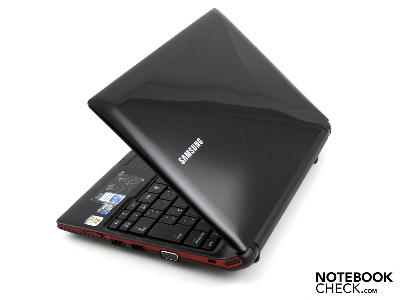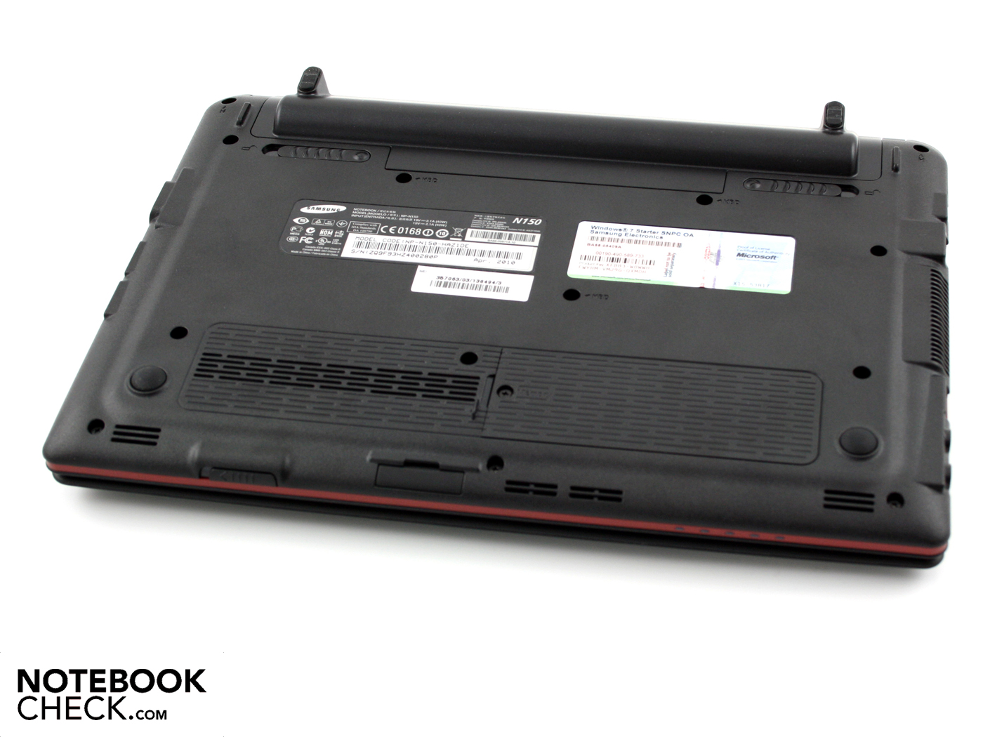 Dem N150 sieht man nicht an, dass es sich um ein Premium-Netbook handelt. Wo bisher ein chromfarbener Streifen das Chassis umrandete (Siehe Samsung N220) erblicken wir nun ein mattes Bordeaux-Rot. Dies ist nicht unbedingt schlecht, jedoch verliert das Gerät ein typisches Stilelement.