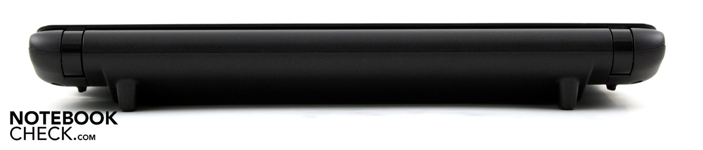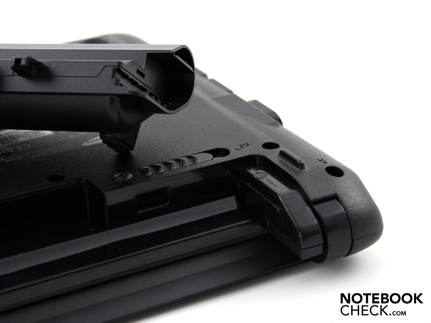 Der Hersteller nennt es stabiles Dura-Case Gehäuse. Etwas Außergewöhnliches ist die Konstruktion aber nicht. Wir haben trotz der Ähnlichkeit zum N220 den Eindruck eines biegsameren Chassis. Mit zwei Händen angefasst können wir die Base Unit leicht verbiegen. Der Deckel ist ungewöhnlich steif. Seine glänzende Fläche kann nur mit Kraft eingedellt werden. Nicht ganz so perfekt ist die Unterseite. Die schraffierte Flächen der Arbeitsspeicher-Klappe und die Lufteinzugsöffnung daneben kann deutlich eingedrückt werden. Der Akku rastet überlappend im Chassis ein. Dadurch sitzt dieser fast so fest am Gehäuse, als ob es eine Einheit wäre.