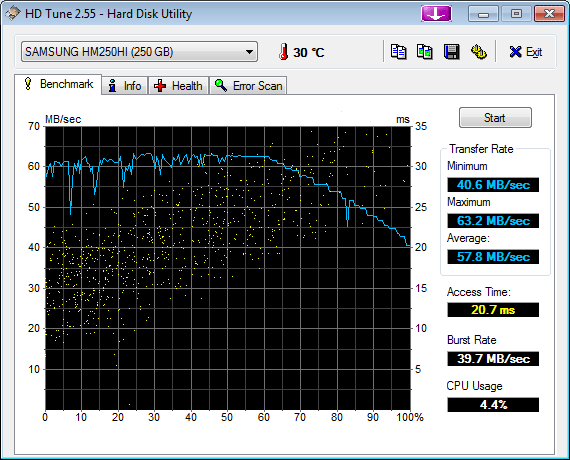 Die Samsung Festplatte (Typ HM250HI) mit einer Bruttokapazität von 250 GByte erreicht im HD-Tune einen brauchbaren Datendurchsatz. 57.8 MB/s liegen im Sequential-Read-Test unter dem Durchschnitt aktueller 2.5-Zoll Notebook-Festplatten. Die HDD ist auch bei starker Aktivität des Lese- und Schreibkopfes nicht lauter als der Idle-Grundpegel.