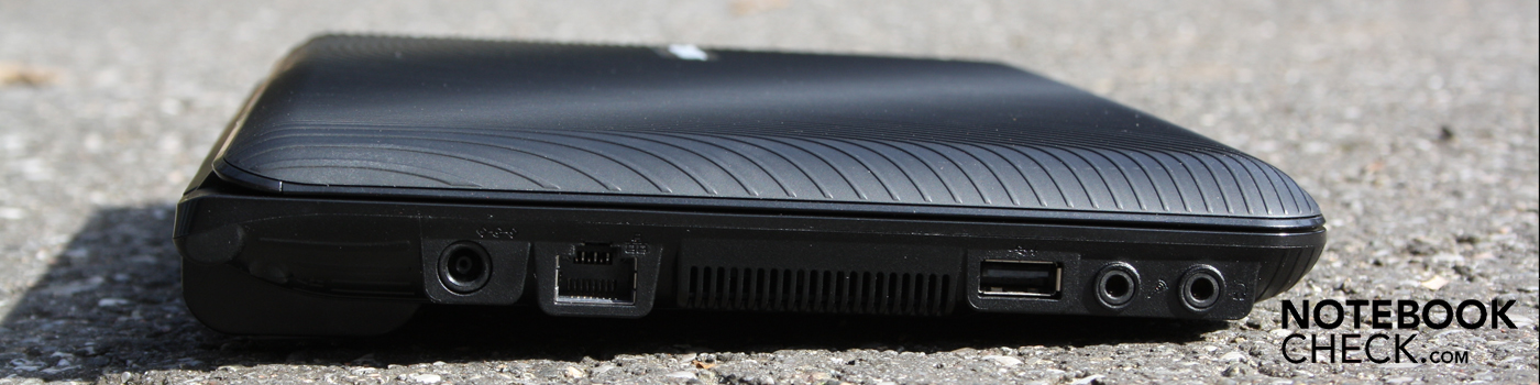 Bei den Anschlüssen gibt es nur Netbook-Schonkost für Anspruchslose. Auf der linken Seite, in Nachbarschaft zum Stromstecker, finden wir den Ethernet-Port. Die gleiche Seite endet frontseitig mit einem USB-Steckplatz, sowie dem Kopfhörer- und Mikrofon-Anschluss. Die USB-Anschlüsse besitzen eine Ladefunktion (Sleep & Charge). Hier können Nutzer zum Beispiel ihr Smartphone laden. Diese Funktion muss aktiviert werden (ChargeableUSB-Tool).