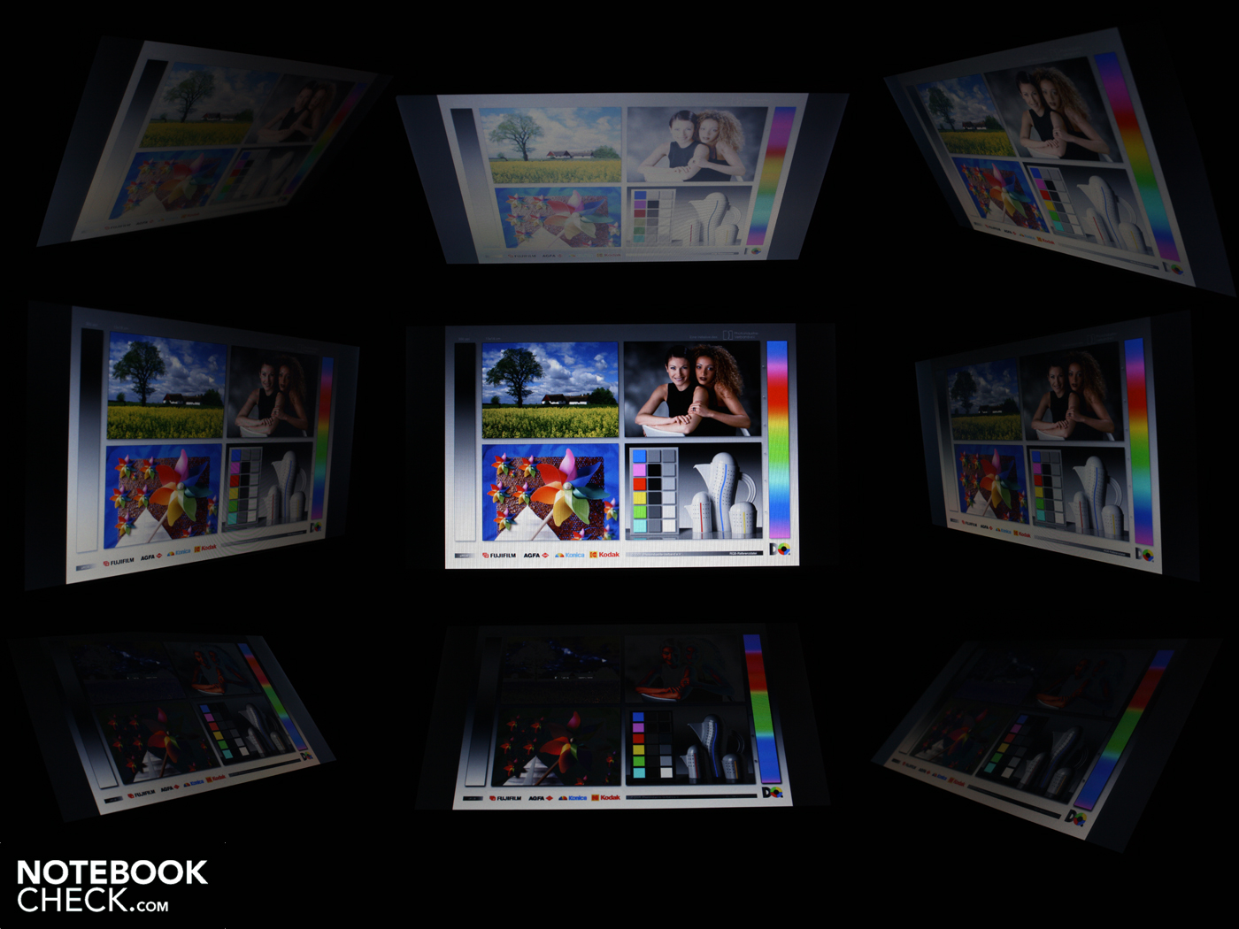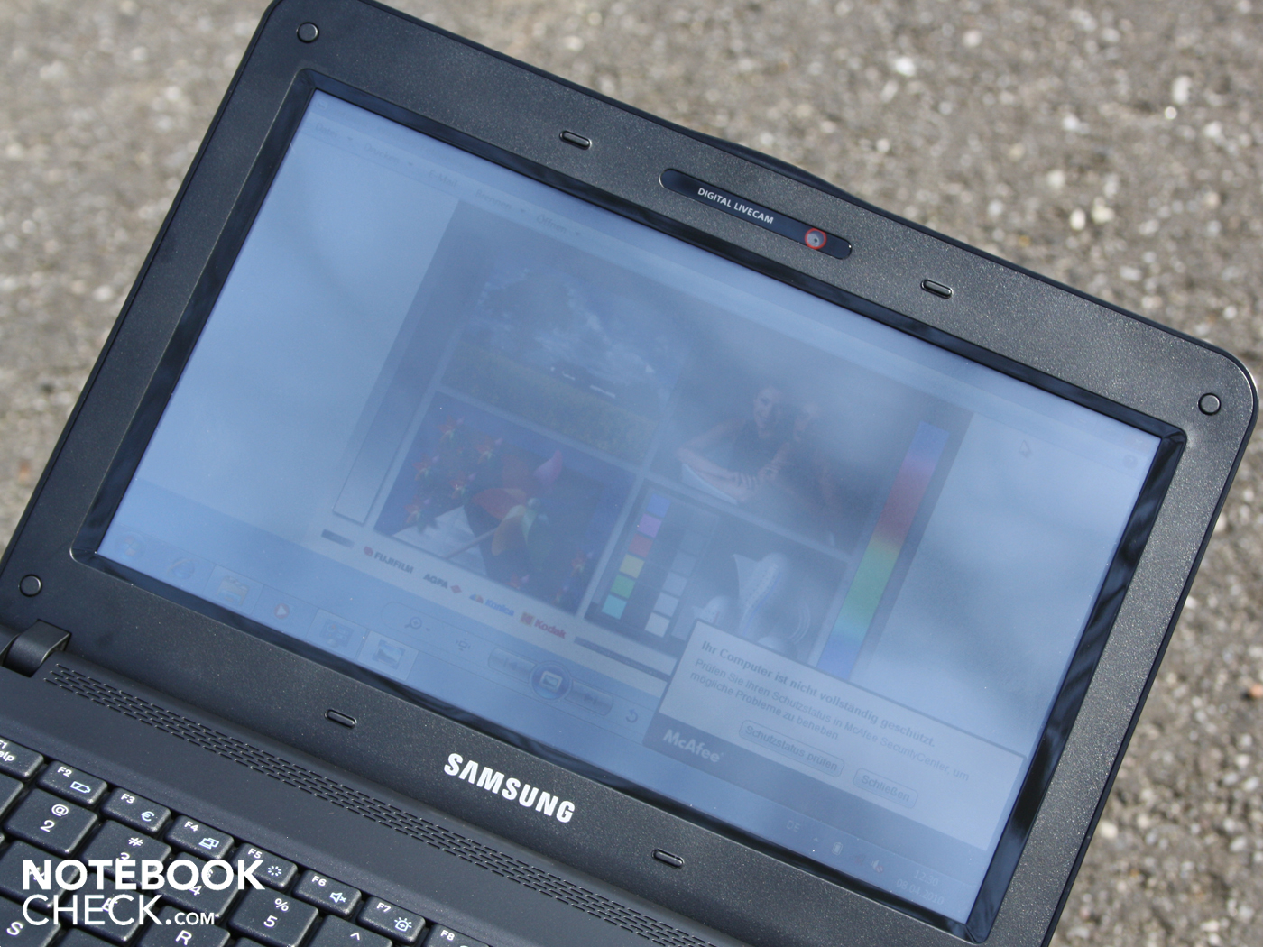 Die Blickwinkel des Samsung NB30-Pro Palm Touch sind in der Horizontalen brauchbar. Bis zirka 45 Grad bleibt Schrift lesbar und Farben sind kaum verfälscht. Danach beginnt aber sofort eine deutliche Verdunkelung des Panels und je nach Lichtquellen setzen schwache Reflexionen ein.
