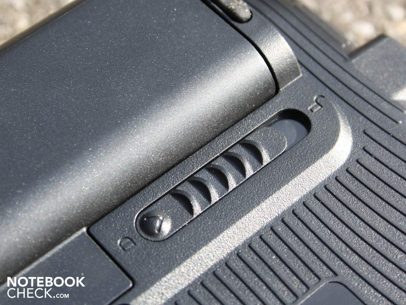 Die Unterseite des NB30-Pro gibt hier und da ein wenig nach, was aber den soliden Gesamteindruck nicht zu stören vermag. Die Arbeitsspeicher-Klappe und die Lufteinzugsöffnung daneben können wir eindellen. Positiv: Das Gehäuse bleibt selbst dann stabil, wenn wir den 6-Zellen-Akku entnehmen.