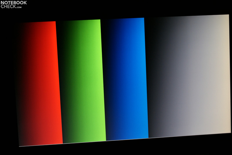 Ein wesentlicher Nachteil des eingebauten Bildschirms ist die schwache Farbdarstellung. Die Farben wirken blass und verschwommen. Auch Schwarz wird nicht optimal dargestellt. Zudem kann man Schlierenbildung mit einem etwa ein Millimeter breiten helleren Streifen entlang der Bildschirmunterkante feststellen.