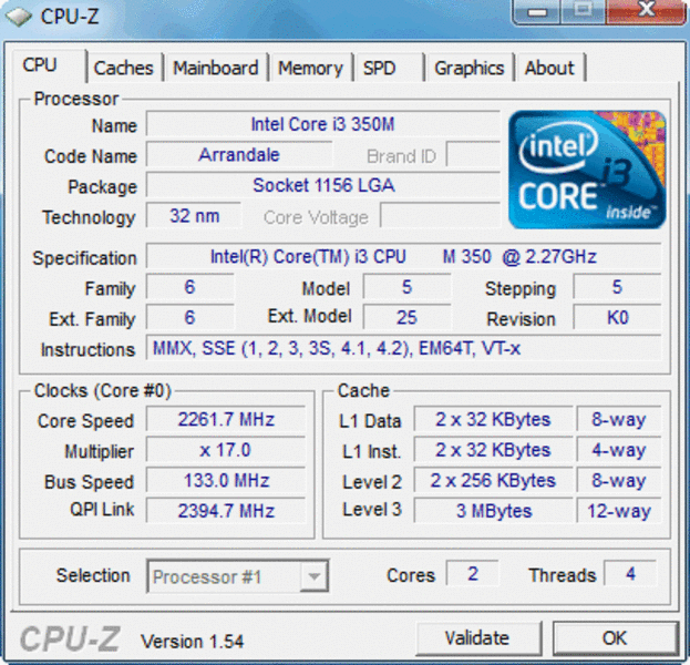 Der Core i3-350M (2 x 2.26 GHz) gehört zu den schwächsten Intel-Core-CPUs und wird in Office-Notebooks oder günstigen Subnotebooks eingesetzt. In Sachen Leistung liegt die 35 Watt CPU (TDP) über dem Pentium (P6000/P6100). Gegenüber selbigem hat der i3-350M den Vorteil von Hyper-Threading (HT). HT sorgt für einen virtuellen Kern je physischem Kern. Der native i3-Zweikerner kann demnach mit vier Threads rechnen.