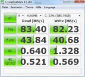 Der PCMark Vantage honoriert eine schnelle Festplatte in hohem Maße. Der HDD Sub-Score liegt bei 3.000 Punkten, ein durchschnittlichen Wert für eine 5.200 U/min HDD. Schnelle 7.200 U/min Festspeicher können um die 3.500 Punkte erreichen. Die Festplatte (500 GB) aus dem Hause Samsung liest mit 66.4 MByte/s im Sequential Read. Die Burst-Rate ist mit 97.4 MB/s relativ hoch (Auslesen des HDD-Cache).