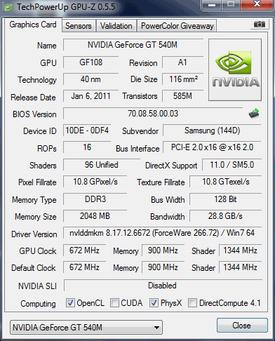 Für mehr grafische Rechenpower sorgt die ebenso integrierte dezidierte Grafikkarte. Hierfür hat der südkoreanische Hersteller die NVIDIA GeForce GT 540M verbaut. Um Energie zu sparen, setzt Samsung auf die NVIDIA Optimus Technologie, denn diese schaltet je nach Bedarf automatisch zwischen der integrierten Intel HD Graphics 3000 und der dezidierten NVIDIA GeForce GT 540M hin und her. Da die integrierte Grafikkarte deutlich weniger Energie verbraucht, verlängert sich dadurch die Akkulaufzeit. Die NVIDIA GeForce GT 540M unterstützt DirectX 11 sowie Shader 5.0 und bietet rund 2 GByte Speicher.