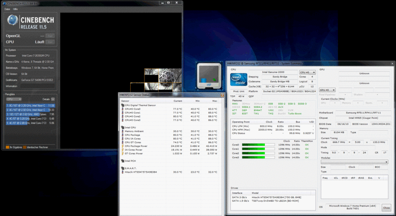 Der CPU-Test Cinebench R11.5 (Multi, 64 Bit) holt 4.18 (Normal-Mode) bis 4.36 Punkte (Speed Mode). Der "identische" 2630QM im Fujitsu NH751 kam jedoch auf 4.83 Punkte; im Aspire 7750G oder Asus G73SW-TZ083V sind sogar 5.0 Punkte drin. Das RF511 hat demnach bei gleicher CPU eine vglw. schwache Rechenleistung. Der Grund: Die anderen Geräte (alle 17-Zoll) können scheinbar den Dynamic Frequency Overhead (Turbo 2.0) auf Grund eines größere Kühlsystems länger ausnutzen. Damit ist die Zeit gemeint, in der die CPU höher als 2.9 GHz taktet, also oberhalb ihrer Turbo Referenz.