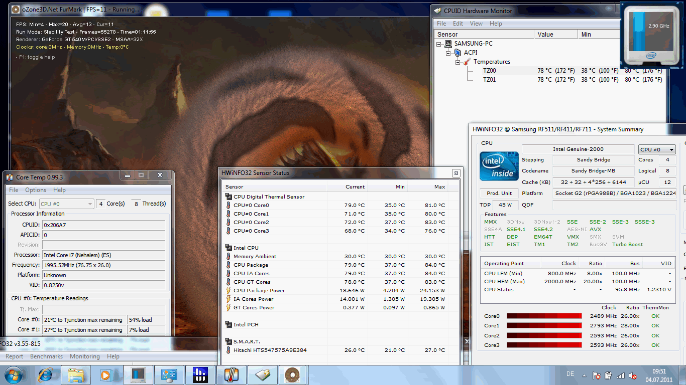 Wie bei vielen Intel Core Prozessoren müssen wir auch im RF511 ein Drosseln der CPU Taktung feststellen. Sobald der Core i7-2630QM (4x 2.00GHz) mit Prime95 ausgelastet ist und die Grafikkarte zeitgleich den Furmark berechnet (=Stresstest), drosselt die CPU nach nach wenigen Minuten von 2.6 auf 2.0 GHz (x4 Kerne). Hier zieht sich der Takt also aus dem Turbo Overhead zurück. Nach weiteren Minuten fällt die Taktung auf 1.4 GHz ab, schwankt dabei aber immer wieder auf 2.0 GHz. An dieser Stelle bleibt das RF511 aber stabil. Die rglm. Schwankung zwischen 1.4 und 2.0 GHz tritt auch auf, wenn Prime95 (CPU 100%) solo läuft.