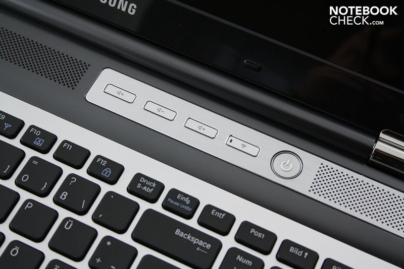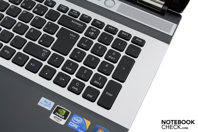 Die guten Eingabegeräte zählen zu den positiven Aspekten des Samsung RF710. Die Tastatur begeistert primär mit ihren freistehenden und klar beschrifteten Tasten, die über eine tadellose Akustik verfügen, intelligent angeordnet sind und bezüglich Druckpunkt und Anschlag ein angenehmes Tippgefühl vermitteln. Der dedizierte Ziffernblock, Sondertasten für Sound bzw. Wlan und gleich zwei Fn-Tasten sind weitere Pluspunkte der (nicht beleuchteten) Tastatur. Die Tastengröße ist mit 15 x 15 mm nicht gerade üppig, in der Praxis tippten wir aber kaum daneben.
