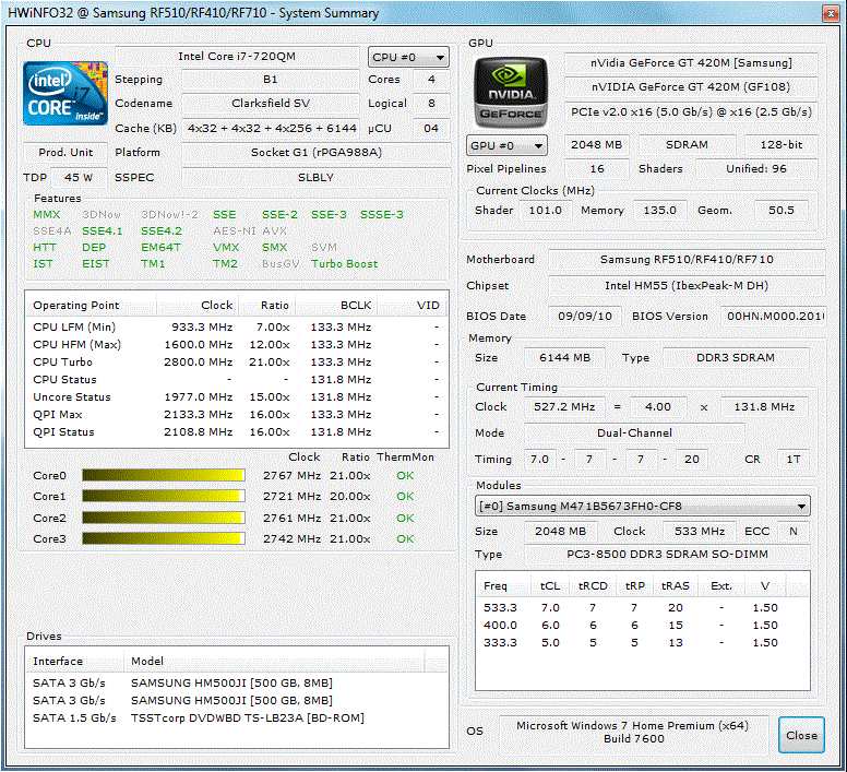 Das von uns getestete Modell NP-RF710-S06DE schlägt mit rund 1340 Euro schon deutlicher zu Buche. Während sich die Arbeitsspeichermenge auf sechs GByte erhöht (4096 MByte + 2048 MByte), verdoppelt sich die Festplattenkapazität auf üppige 1000 GByte (2x 500 GByte, 5400 U/Min). Bei der Grafikkarte hat sich Samsung in diesem Fall für die DirectX 11 fähige GeForce GT 420M entschieden. Highlight ist indes wohl der verbaute Vierkernprozessor, Intel´s Core i7-720QM bietet Leistung satt.