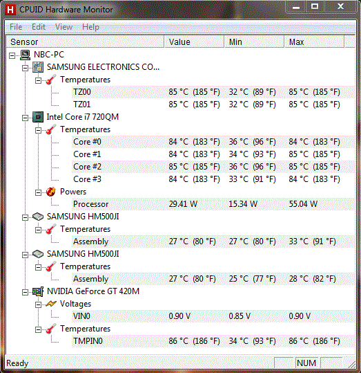 Ein ähnliches Bild ergibt sich bei den Komponenten. Im Idle-Betrieb werden GeForce GT 420M und Core i7-720QM mit rund 37 respektive 40°C (noch) tadellos gekühlt. Unter Volllast kommt es hingegen zu einer relativ starken Erhitzung, maximal 85°C für den Prozessor und maximal 86°C für die Grafikkarte sind jedoch nicht bedenklich. Einziges Problem: Innerhalb unseres mehrstündigen Stabilitätstests mit den Tools Furmark und Prime taktete sich der Prozessor nach einer Weile von 1.60 auf 1.33 GHz herunter (CPU-Throttling). Bei den umfangreichen Anwendungs- und Spielebenchmarks gab es glücklicherweise keinerlei Auffälligkeiten.