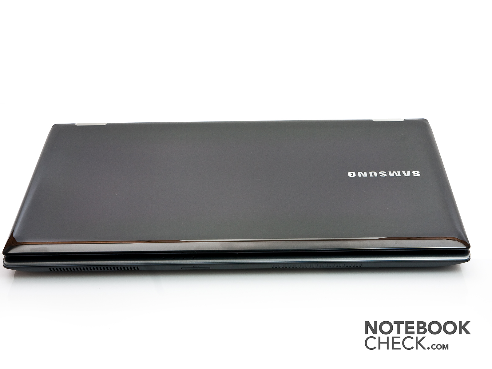 Unser Testmuster des Samsung RF711 präsentiert sich in schlichtem Schwarz. Der Displaydeckel verfügt über eine Hochglanzoberfläche. Diese ist zwar sehr anschaulich, zieht dafür aber auch Fingerabdrücke und Staub magisch an. Ein Reinigungstuch sollte also stets griffbereit sein. Für Akzente auf dem Displaydeckel sorgen das glänzende Samsung-Logo und die ebenfalls glänzenden Displayscharniere. Der imitierte Chromeffekt bietet einen netten Kontrast zu dem hochglänzenden Schwarz, das ohne die Chromimitationen doch etwas langweilig ausgesehen hätte. Die Displayscharniere sind von Samsung sehr hart eingestellt worden um das schwere 17 Zoll Display sicher an Ort und Stelle zu halten. Trotzdem lässt sich das RF711 gerade noch mit einer Hand öffnen. Gerade noch deswegen, da der untere Teil des Notebooks schon leicht mit angehoben wird, aber nicht komplett vom Tisch abhebt.