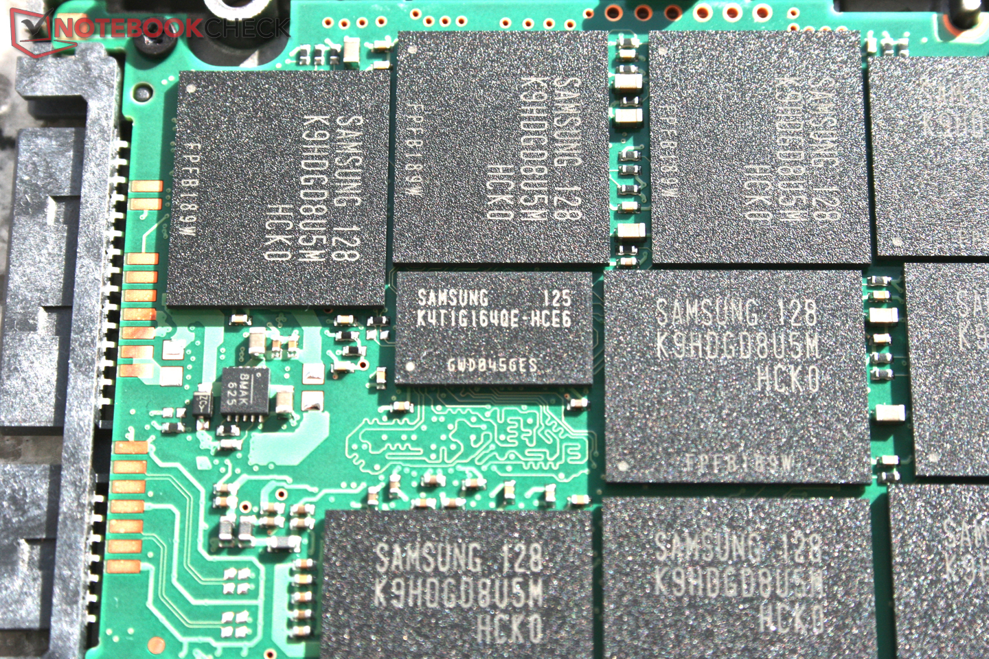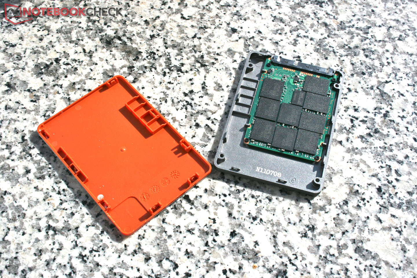 Das Innenleben offenbart sich nach etwas fummeligem Abheben der orangen Kunststoffschicht, welche mit Plastikhaken mit der Unterseite verbunden ist. Dort finden wir wie zu erwarten Controller, Cache und die MLC Speicherchips von Samsung.