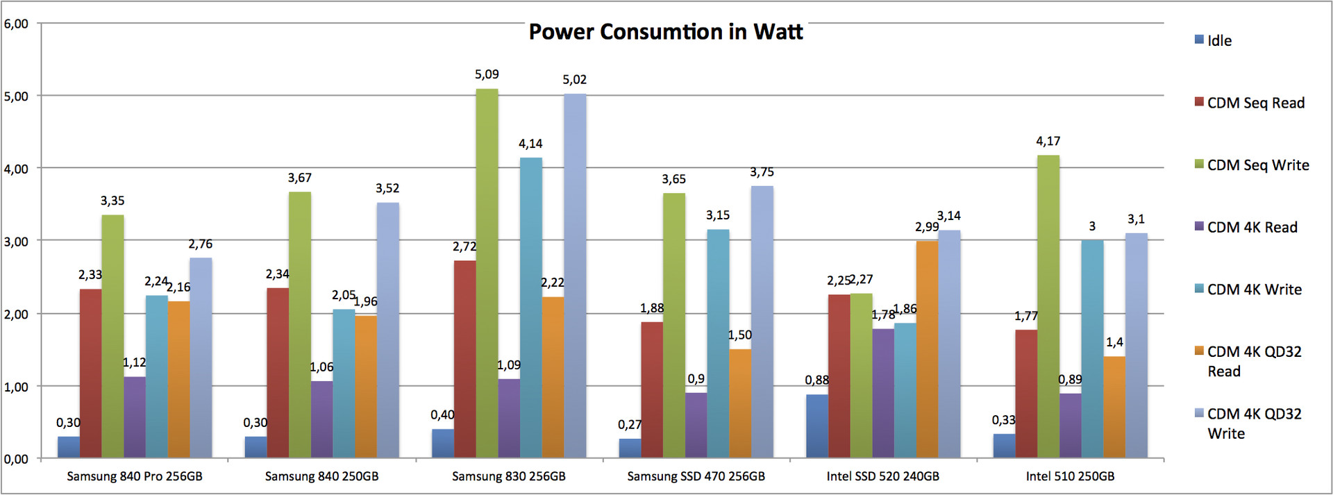 Unter Last kann die Intel 520 dann aber doch an der 840 Pro vorbeiziehen und überzeugt vor allem mit dem niedrigsten Stromverbrauch beim Schreiben.