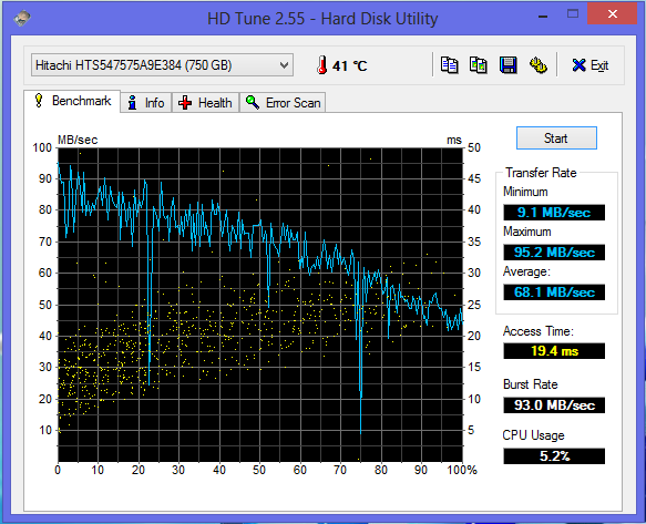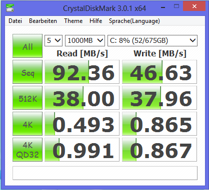 Als Datenspeicher dient im 355E5C eine Festplatte aus Hitachis Travelstar 5K750-Serie. Die Platte arbeitet mit einer Geschwindigkeit von 5.400 Umdrehungen pro Minute und bietet eine Speicherkapazität von 750 GB. Somit steht viel Speicherplatz für Musikdateien, Videos und Bilder bereit. HD Tune liefert eine durchschnittliche Transferrate von 68,1 MB/s. CrystalDiskMark meldet eine Lesegeschwindigkeit von 92,36 MB/s. Insgesamt siedelt sich die Platte im Mittelfeld für 5.400er-Festplatten an.
