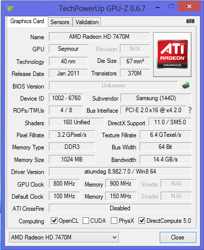 Die im 355E5C verbaute APU enthält die integrierte Radeon HD 7340 GPU. Samsung hat diese GPU komplett deaktiviert und dem Rechner die etwas stärkere dedizierte Radeon HD 7470M GPU spendiert. Dieser Einsteiger-Grafikkern unterstützt DirectX 11 und arbeitet mit Geschwindigkeiten bis zu 800 MHz.