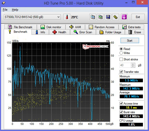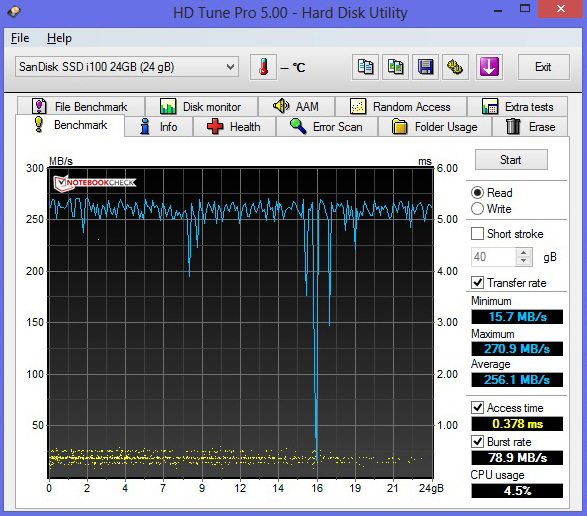 Der Flaschenhals sind allerdings die hohen Zugriffszeiten. HD Tune Pro 5.00 ermittelt einen Wert von 18,1 Millisekunden. Im direkten Vergleich kann sich das unterstützende Solid State Drive von SanDisk (U100) sehen lassen. Die Zugriffszeit beträgt geringe 0,378 Millisekunden. Mit einer Kapazität von 24 GB ist es aber nur als Zwischenspeicher gedacht. Subjektiv kann die Leistung des Systems aber auch ohne vollwertiges SSD mit 128 oder 256 GB überzeugen.
