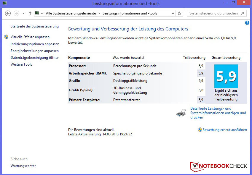 Abschließend noch kurz einen Blick auf den Leistungsindex von Windows 8. Dieser zeigt Schwächen bei der Speicherausstattung und dem Speichermedium auf. Genau diese zwei Punkte kann man im Nachhinein beeinflussen. Der RAM lässt sich leicht aufrüsten, wobei insgesamt 8 GB mehr als ausreichend sein sollten. Zudem profitiert das System dann von der Dual-Channel-Technologie. Die Leistung wird erhöht. Bei der „Primären Festplatte“ greift sich der Index die Festplatte von Seagate, wodurch die Wertung nur 5,9 beträgt. Eine SSD würde auch diese Wertung anheben.
