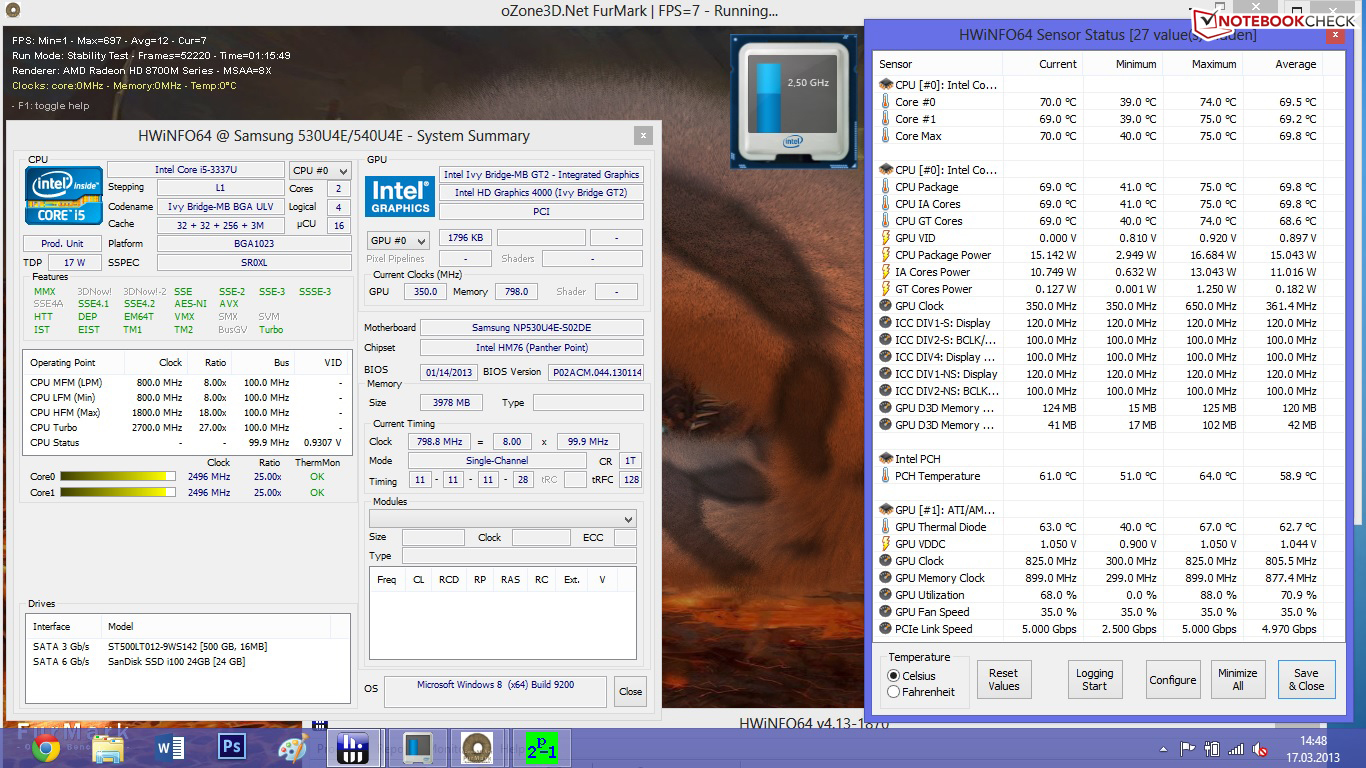 Wir testen mit dem 530U4C-S02DE das aktuell einzig neue Modell der Serie 5 mit 14-Zoll-Bildschirm. Der zentrale Bestandteil ist ein Intel Core i5-3337U Dual-Core-Prozessor (2 Kerne, 4 Threads). Bei diesem Chip handelt es sich um eine Ultra-Low-Voltage-Ausführung (ULV), die speziell für die Geräteklasse Ultrabook gedacht ist. Der Prozessor arbeitet mit einem Basistakt von 1,8 GHz. Bei Belastung können über den Turbo Boost bis zu 2,7 GHz bei der Nutzung eines Kerns abgerufen werden. Im Dual-Core-Betrieb sind es maximal 2,5 GHz. Der von uns getestete i5-3337U stellt den Nachfolger des zuvor sehr häufig genutzten Intel Core i5-3317U dar. Die Basis bilden weiterhin die Ivy-Bridge-Architektur mit 22 Nanometer Strukturbreite und ein 3 MB großer L3-Cache.