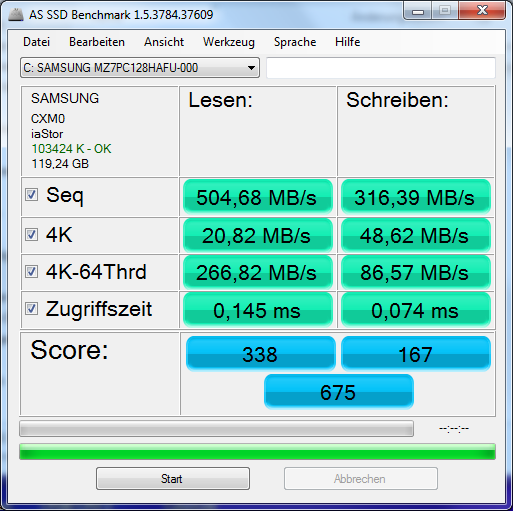 Das Testmodell ist mit einem schnellen Solid State Drive aus eigenem Hause bestückt. Transferraten, Zugriffszeit und das subjektive Geschwindigkeitsgefühl sind deutlich besser, als man es von konventionellen Festplatten her kennt. Nicht so gut ist der für manche Einsatzgebiete zu knappe Speicherplatz. Mit einigen Programmen, Videos, Fotos oder vielleicht auch Spielen bestückt, stößt man schnell an die Speichergrenze von netto 98 Gigabyte. Ein zweites Laufwerk lässt sich unserem Kenntnisstand nach nicht integrieren. Weder ein mSATA-Steckplatz noch ein zweiter Massenspeicherschacht stehen zur Verfügung. Auch konnten wir keinen passenden Caddy als Ersatz für das optische Laufwerk finden. Wer eine Speicherplatzerweiterung anstrebt, muss entweder das vorhandene Laufwerk austauschen oder auf eine externe Lösung ausweichen.