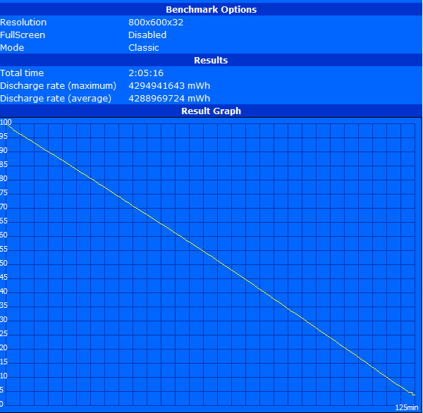 Beim Battery Eaters Classic Test (minimal mögliche Laufzeit, maximale Helligkeit, alles an, Höchstleistungsprofil) sind lediglich noch knapp 2 Stunden Akkulaufzeit möglich. Dieses Ergebnis ist allerdings nicht repräsentativ, da wir den Wert der integrierten Intel HD Graphics 4000 zugrunde legen. Die dedizierte Nvidia NVS 5200M hat im Gegensatz zu unseren sonstigen Tests im Akkubetrieb mit lediglich 162 MHz getaktet. Hier vermuten wir eine Besonderheit des Battery Eater Tools im Zusammenspiel mit der Nvidia NVS 5200M. Im Ergebnis übertrifft die Nvidia Lösung mit 125 Minuten Laufzeit sogar das Ergebnis der Intel HD Graphics die mit 650 MHz Takt zu Werke geht. In der Praxis sollte man mit der dedizierten Grafik unter Volllast nicht mit mehr als einer Stunde Laufzeit rechnen.