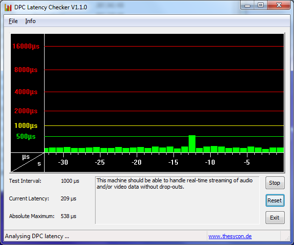 Mit dem DPC Latency Checker überprüfen wir das System auf mögliche Latenzen bei der Verwendung externer Geräte. Sind die Verzögerungen zu groß, kann es zu Synchronisationsfehlern, Dropouts und Ähnlichem kommen. Beim ersten Durchlauf haben wir zwei hohe Ausschläge festgestellt, die weit über das Limit von 2000 µs hinausschießen. Durch das Deaktivieren der Funkmodule konnten diese Ausreißer unterbunden werden. Zukünftig sollte hier ein Treiber-Update für Besserung sorgen.