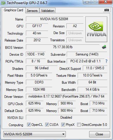 Nvidias Optimus Technologie beschert dem Samsung 600B5C gleich zwei nutzbare Grafikchips. Etwas ärgerlich ist hier jedoch, dass die 3D-Performance der dedizierten Nvidia NVS 5200M nur etwas über der Leistungsfähigkeit der Intel HD Graphics 4000 angesiedelt ist. Dadurch reduziert sich die Liste zusätzlicher Einsatzgebiete merklich. Übrig bleiben im Wesentlichen nur Aufgaben, die von Nvidias CUDA-Engine profitieren, ein Multimonitorbetrieb oder eine etwas bessere 3D-Spieleleistung. Inwieweit sich der theoretisch mögliche Multimonitorbetrieb mit bis zu 4 Displays umsetzen lässt, konnten wir nicht herausfinden. Nvidias NVS 5200 kann laut Datenblatt bis zu 4 Displays gleichzeitig ansteuern und wird dafür wie bei den Lösungen der Konkurrenz die Dockingstation benötigen. Ob das so wirklich funktioniert, konnten wir mangels Equipment nicht ausprobieren.