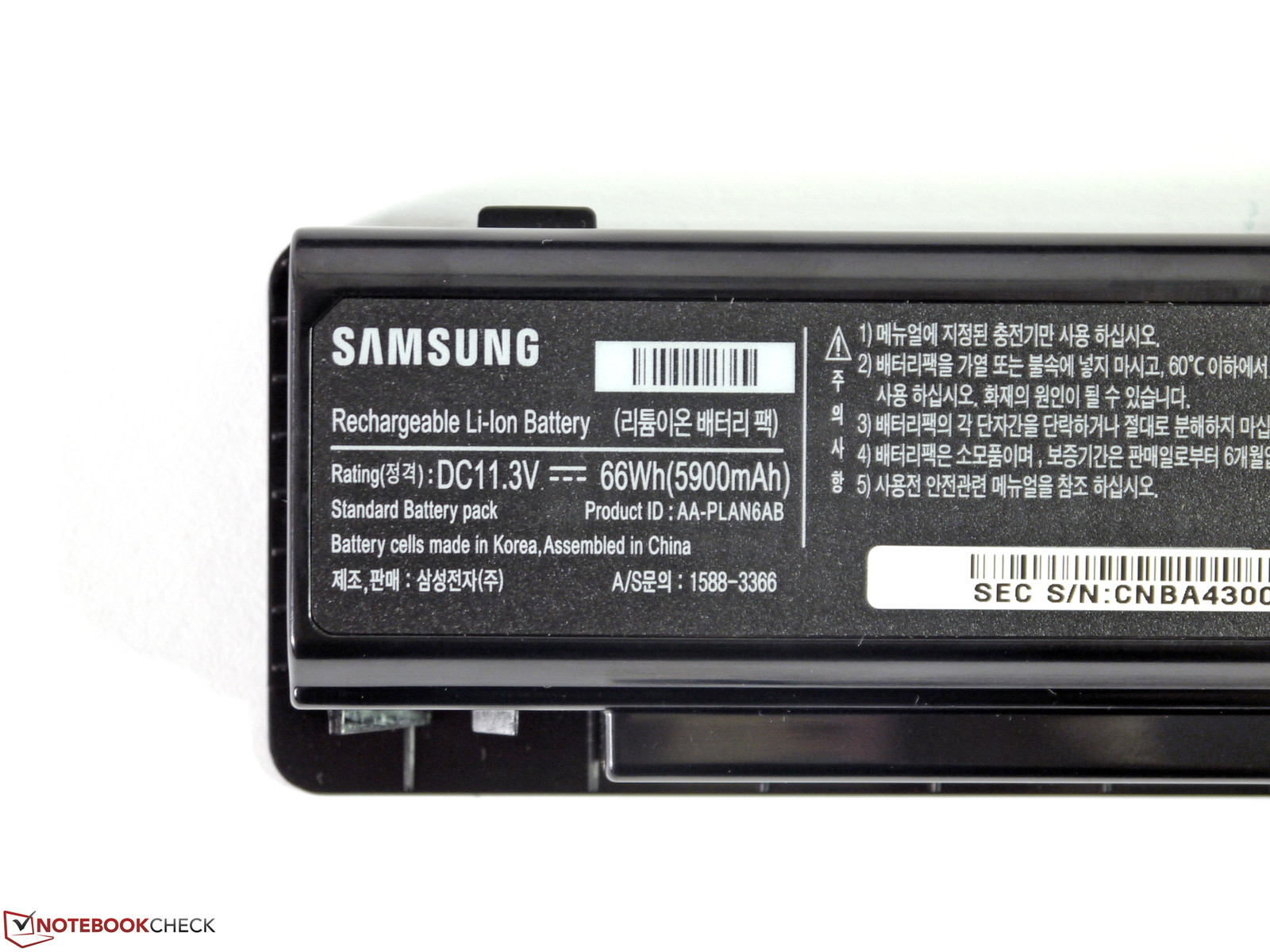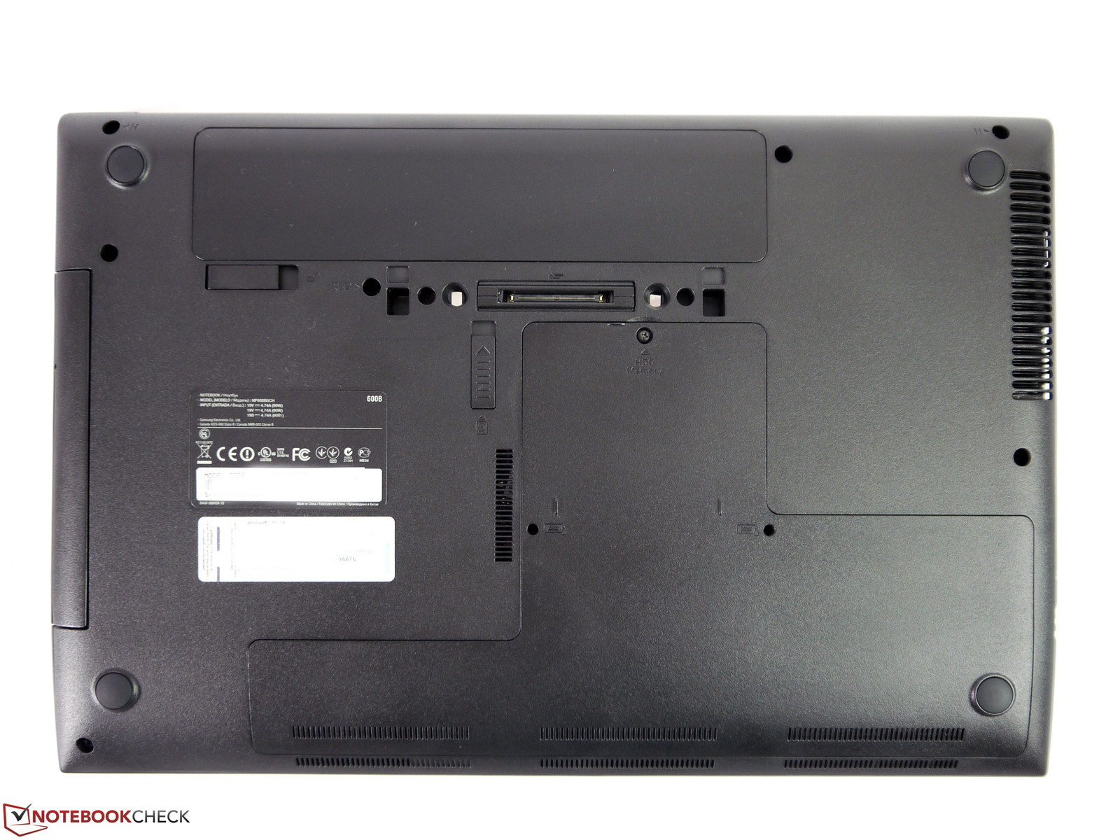 Im Datenblatt zum Serie 6 60B5C führt Samsung einen 6-Zellen-Akku mit 48 Wh Kapazität auf. Bei unserem Testmodell ist jedoch ein 6-Zellen-Akku mit 66 Wh beigelegt. Ein optional erhältlicher Longlife-9-Zellen-Akku ist deutlich größer als die Variante, die wir bei unserem Testmodell finden und bockt das Notebook im Heckbereich gehörig auf. Er kostet etwa 100 Euro (AA-PLAN9AB/E). Etwas widersprüchlich sind Samsungs Angaben dazu: Einerseits wird von 66 Wh gesprochen, und andererseits gibt man 11,3 V und 8850 mAh an, was etwa 80 Wh entsprechen würde. Aufgrund der Größe scheint uns eher Letzteres plausibel.