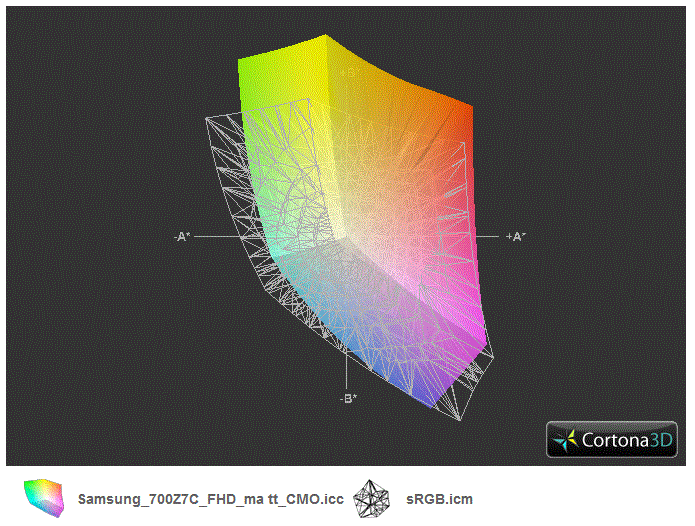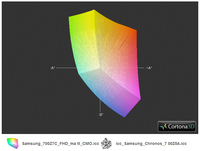 Der Farbraum, wichtig vor allem für Profi-User, verpatzt allerdings das große Lob: sRGB wird verfehlt, Adobe RGB noch deutlicher. Das Panel hat jedoch einen Überhang im grün-roten Bereich. Der Farbkalibrierer i1Display zeigt folgende ICC-Profile im Vergleich mit dem 15.6-Zoller Chronos 700Z5A und anderen. Der Chronos-15-Vergleich (Gitter) zeigt den enormen Qualitätsunterschied: Unser 17.3-Zoller deckt einen ungleich größeren Farbraum ab. Selbst Samsungs Gamer 700G7A und der Gamer MSI GE70 (jeweils 17.3-Zoll) liegen hinter unserem Testgerät.