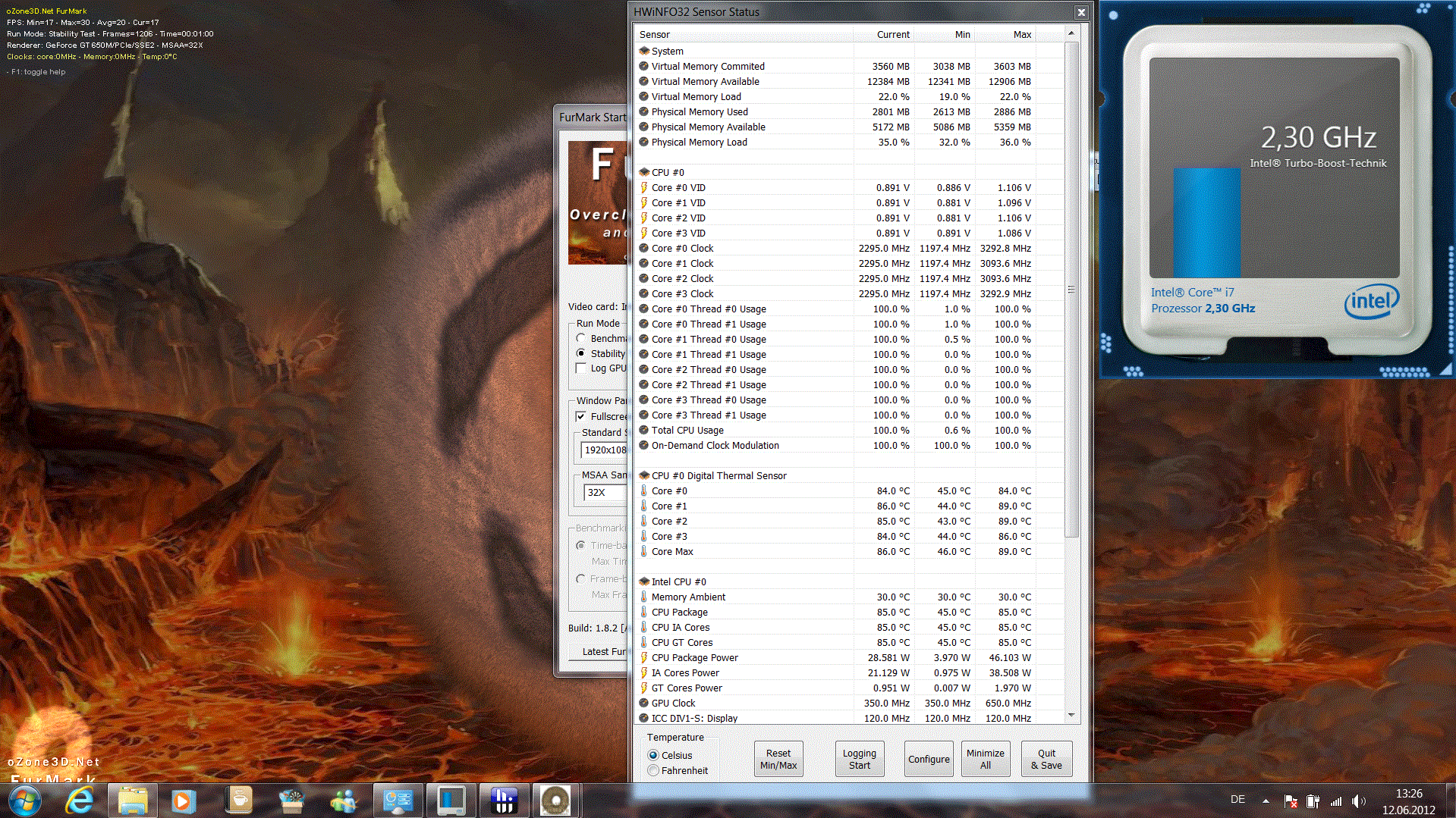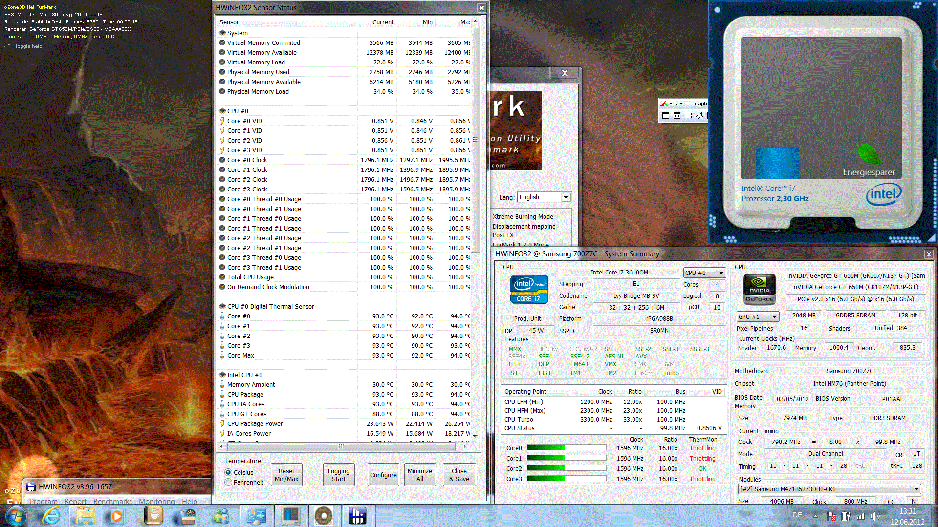 Der Intel Core i7 3615QM (4 x 2.3 GHz) ist noch selten auf dem Markt zu finden, im Gegensatz zu seiner Quad-Schwester 3610QM (4 x 2.3 GHz). Der Ivy Bridge-Prozessor schaltet im Turbo 2.0 bis auf 3.3 GHz, vorausgesetzt das Kühlsystem kann die Abwärme schnell abführen.