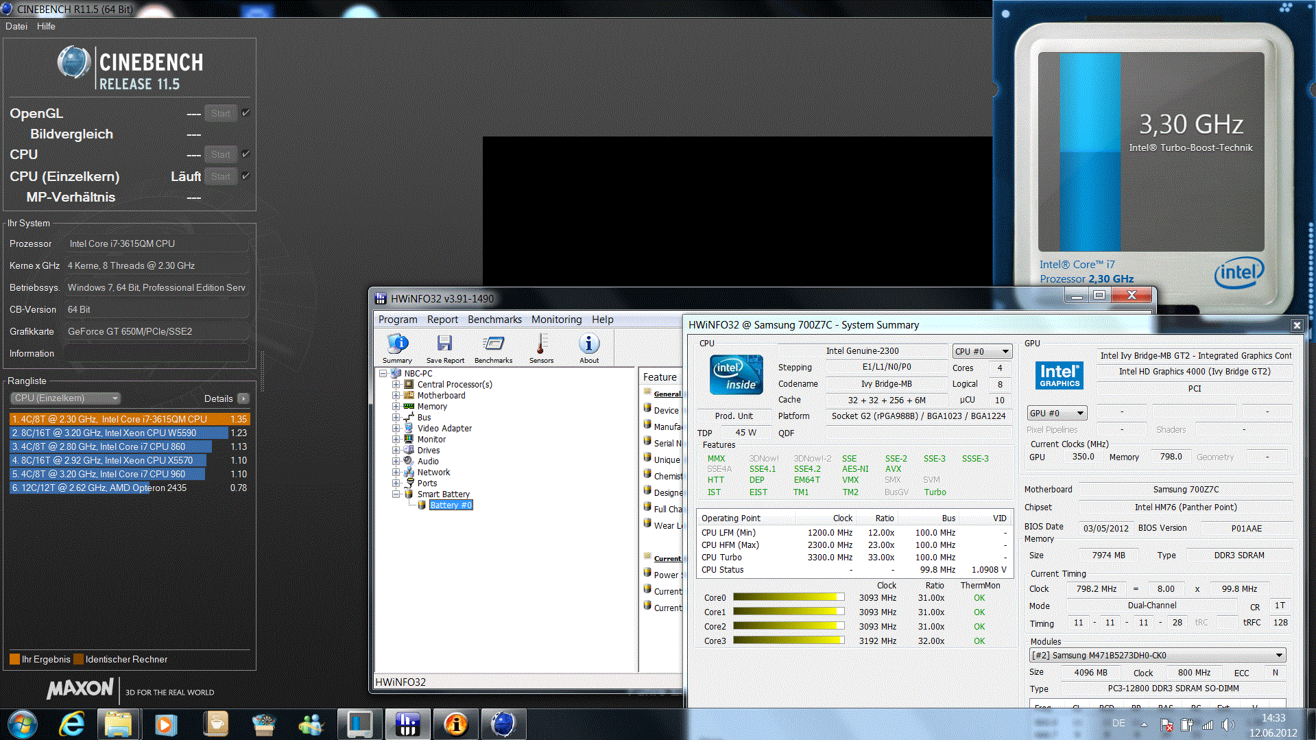 CPU-Optionen gibt es bei Samsung nicht für das 17-Zoll Chronos. Der i7 3615QM ist aber grundsätzlich keine schlechte Wahl für einen Multimedia-Arbeitsplatz, der auch als Desktop-Replacement fungieren kann. Alle Tests der Single- oder Multi-Core Rechengeschwindigkeit liegen sehr dicht am ident taktenden Schwestermodell 3610QM, das in vielen günstigeren Spiele-Laptops eingesetzt wird (z. B. Asus A95VM-YZ030V). Der Multi-Core-Test Cinebench R11.5 64 Bit heimst 6.26 Punkte ein, das ist doppelt so viel, wie der i5 2430M (4 statt 8 Threads) mit 2.67 Punkten schaffte (Samsung Chronos 700Z5A-S01DE). Selbst der teure Extreme Prozessor 3920XM (Schenker XMG P702 PRO, DTR) oder der höher taktende 3720QM (Asus G75V, DTR) steht mit 7.07 bzw. 6.8 Punkten nicht deutlich besser da (nur +9 bzw. 13%).