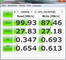Die rotierende Seagate Momentus überrascht nicht etwa durch ihre Kapazität von 1.000 GB, sondern durch hohe Lese- und Schreibraten trotz langsamer 5.400 Umdrehungen pro Minute: 79 bzw. 100 MB/s (HD-Tune / Crystal Disk Mark) bei großen, nicht verstreuten Dateien. Ihre Schwachstelle ist jedoch ihre sehr schlechte Zugriffszeit von 20.3 Millisekunden (Reaktion des Lese/Schreibkopfes). Dies sorgt für schlechte Durchsätze beim Lesen/Schreiben verstreuter Dateien (Siehe Crystal Disk Mark 4K Tests). Gute Zugriffszeiten einer HDD liegen bei 16 ms, wie das Samsung 550P7C-S02DE (Hitachi Travelstar 7K750 HTS727575A9E, 7200RPM) dieser Tage bewies und immerhin 750 GB im Angebot hat.