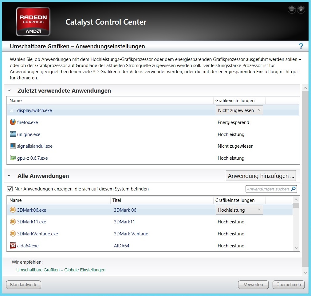 Im Menü »Umschaltbare Grafiken – Anwendungseinstellungen« kann man einzelne Programme manuell der integrierten (»Energiesparend«) oder dedizierten GPU (»Höchstleistung«) zuweisen. Wer faul ist, verstellt einfach das globale Preset (bei »Leistung maximieren« werden 3D-Programme zuverlässig mit der Radeon HD 8870M gestartet.
