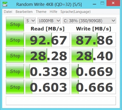 Angefangen bei HDTune, das der Festplatte eine Zugriffszeit von 19,2 ms und eine Übertragungsrate von rund 84 MB/Sek bescheinigt. Der CrystalDiskMark nennt dagegen 93 MB/Sek (sequentielles Lesen) bzw. 88 MB/Sek (sequentielles Schreiben). Die ebenfalls 1.000 GByte große und 5.400 U/Min flotte Toshiba MQ01ABD100 schafft hier etwas höhere Werte (knapp über 100 MB/Sek beim Nexoc M507II).