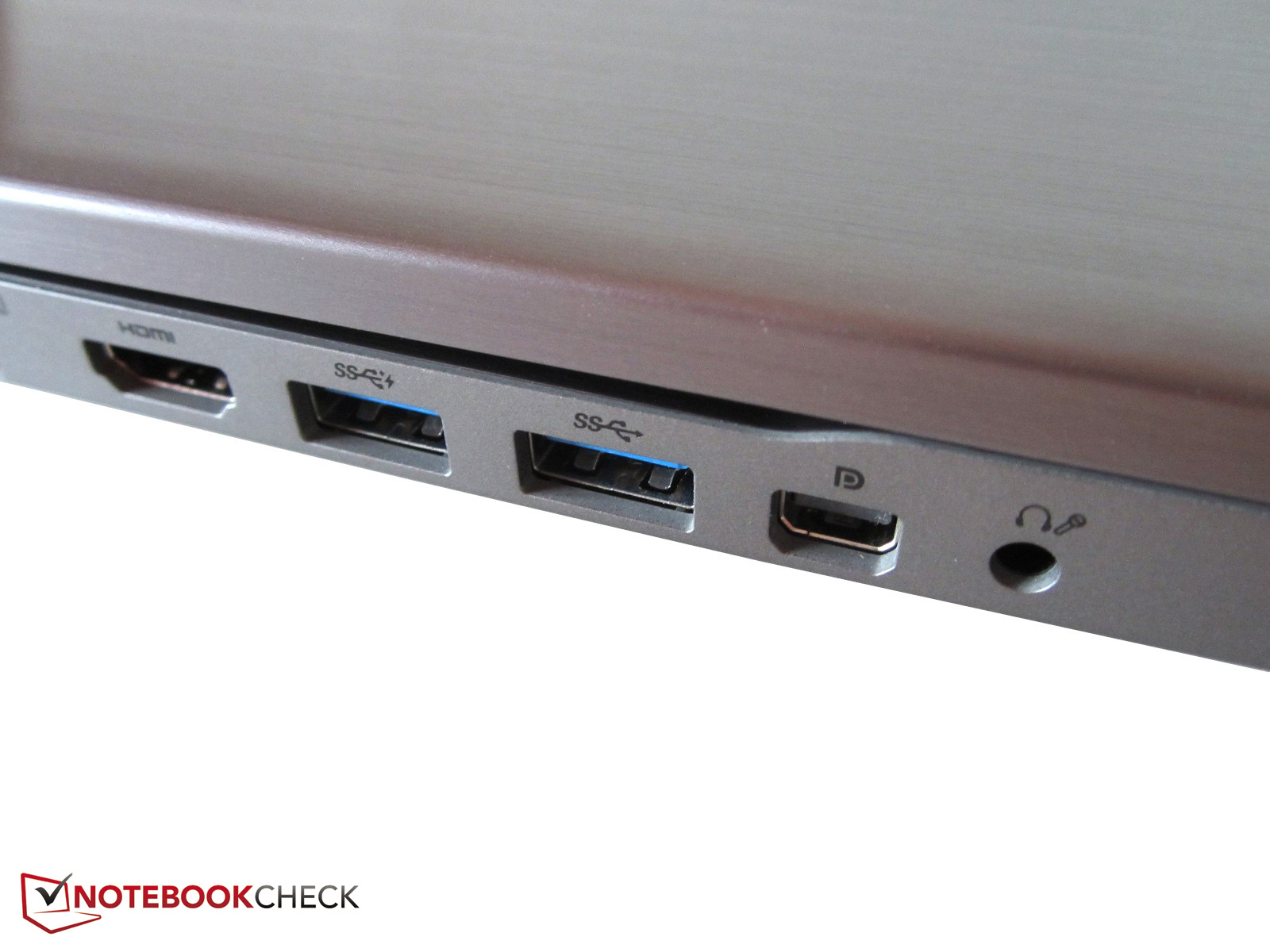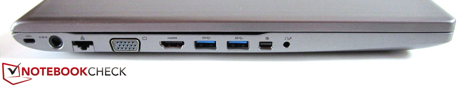 Die Anschlussausstattung muss sich nicht hinter der Multimedia-Konkurrenz verstecken. Drei Bildausgänge (VGA, HDMI & Mini-DisplayPort) sind ebenso respektabel wie vier USB-Ports (2x USB 2.0 & 2x USB 3.0). Im hinteren Bereich der linken Seite warten zudem ein Kensington Lock, ein (ausklappbarer) RJ-45 Gigabit-Lan-Port und der Stromeingang.