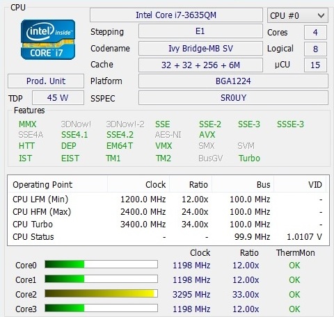 Mit 1,4 Milliarden Transistoren, sechs MByte L3-Cache und einem Takt von 2,4-3,4 GHz entspricht der Core i7-3635QM dem bekannteren Bruder Core i7-3630QM. Unterschiede ergeben sich lediglich beim Takt des Grafikchips und der Feature-Liste. Während die HD Graphics 4000 beim Core i7-3635QM mit bis zu 1.200 MHz läuft, sind es beim Core i7-3630QM »nur« 1.150 MHz. Letzteres Modell bietet außerdem keinen Support für die Virtualisierungs-Technik VT-d.