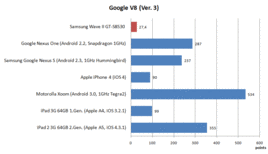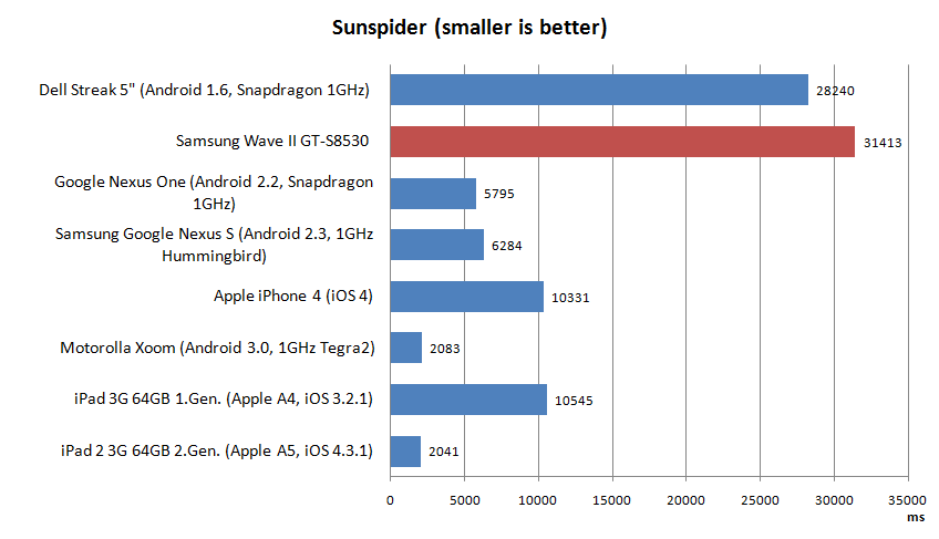 Dass dies nicht nur ein subjektiver Eindruck bleibt, das bestätigen auch die beiden durchgeführten Browser-Benchmarks. Der Google V8 Benchmarktest schneidet mit weniger als 30 Punkten sehr enttäuschend ab. Nicht viel besser ergeht es dem Wave II im Sunspider Benchmarktest. Dort fällt das Smartphone sogar noch hinter Dells Streak 5" in der ersten Ausgabe mit Android 1.6 zurück, das ebenso noch zahlreiche bekannte Schwächen hinsichtlich Performance mit sich brachte.