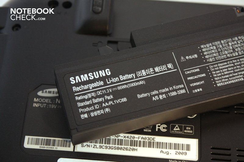 Verantwortlich für diese sehr guten Laufzeiten ist auch der von Samsung selbst produzierte Lithium-Ionen-Akku. Er besitzt 6 Zellen und 66 Wattstunden Kapazität. Vorsicht sollten Käufer walten lassen, da Samsung sein Gerät auch mit einem kleineren Akku mit nur 49 Stunden Kapazität anbietet. Dieser verkürzt die maximale Mobilität um bis zu 3 Stunden.
