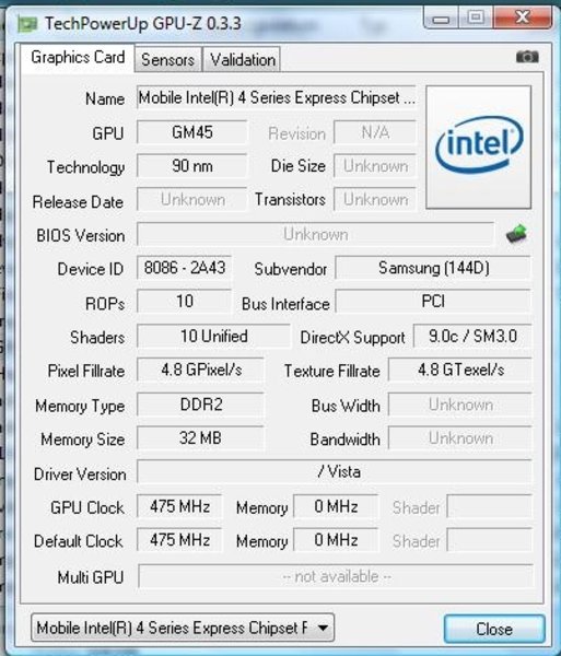 Als Grafikkarte setzt Samsung auf die GMA X4500M HD von Intel, die bereits im Chipsatz des Mainboards integriert ist und über keinen eigenständigen Grafikspeicher verfügt. Dafür reserviert sich die Karte je nach Beanspruchung bis zu 384 MByte des Hauptspeichers.