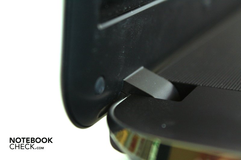 Der Displaydeckel ist wiederum ausreichend stabil und lässt leichten Druck von hinten nicht durch. Die Scharniere sind wie schon bei den kleineren Modellen vorne am Monitorrahmen angebracht, so dass die Unterkante des Bildschirms hinter dem Notebookgehäuse verschwindet, wenn man diesen aufklappt.