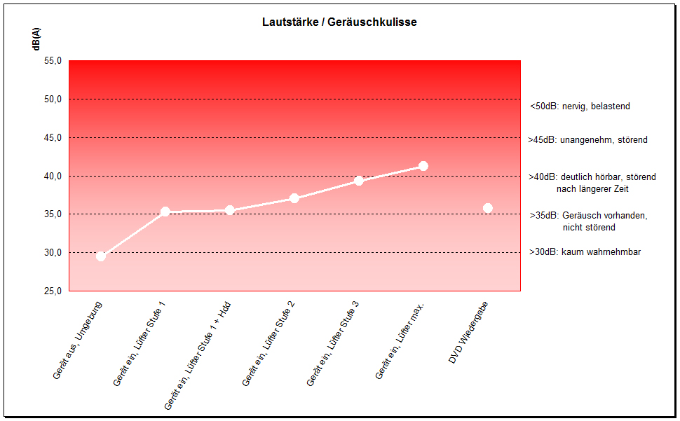 Trotz des ständigen Laufens des Lüfters auch ohne Last mit einer Geräuschentwicklung von 35.3 dB fällt das Notebook nicht unangenehm ins Ohr. Auch die unter Last maximal erreichten 41.2 dB sind durchaus moderat. Das DVD Laufwerk ist mit einer Wiedergabelautstärke von 35.8 dB durchaus akzeptabel. Auffällig war jedoch eine wesentlich höhere Geräuschentwicklung bei der Wiedergabe von Musik CD’s.