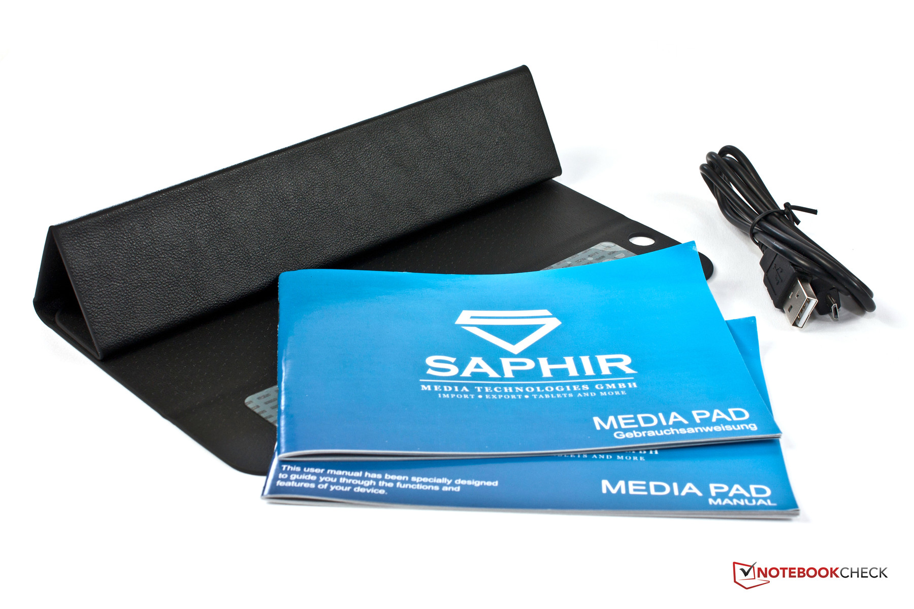 Saphir legt dem Käufer seines Tablets einiges mit in die Umverpackung. Neben zwei Gebrauchsanweisungen (Deutsch/Englisch) erhält der Kunde ein Netzteil, eine Schutzhülle, einen Adapter von Micro-USB zu USB, ein Headset, ein Datenkabel, ein Mikrofasertuch und sogar ein HDMI-Kabel. Leider können nicht alle Beigaben qualitativ überzeugen. Die Adapter funktionieren, ebenso das HDMI-Kabel, aber die Schutzhülle ist optisch wie haptisch ein Graus. Das Mikrofasertuch kann ebenfalls nicht die Erwartungen erfüllen, denn Fingerabdrücke ließen sich damit nicht vom Display entfernen.