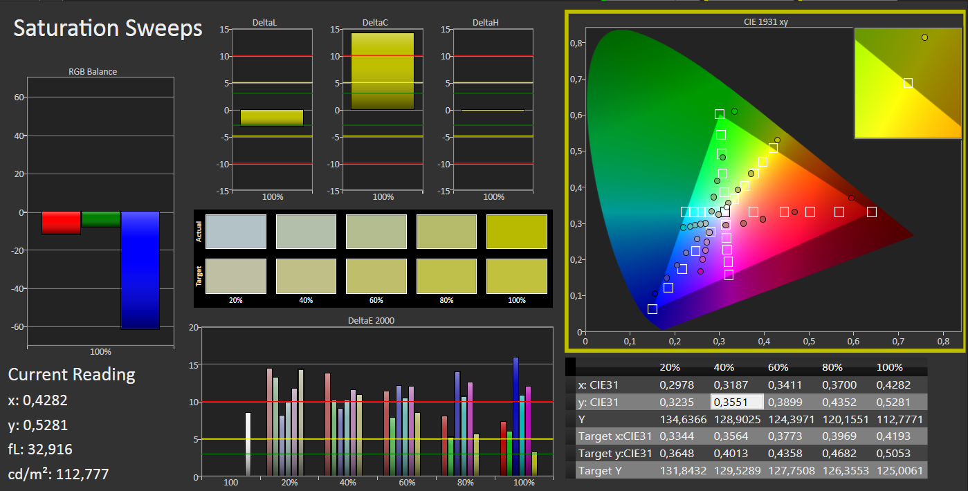 Im Auslieferungszustand liegt die durchschnittliche DeltaE-2000-Abweichung des Bildschirms bei einem Wert von 9,66. Ähnliche Werte liefern die meisten von uns vermessenen Bildschirme. Den Zielbereich (DeltaE kleiner 3) erreicht keine Farbe. Zudem besitzt der Bildschirm einen deutlichen Blaustich. Durch eine Kalibrierung des Bildschirms kann er beseitigt werden. Wir haben es ausprobiert.