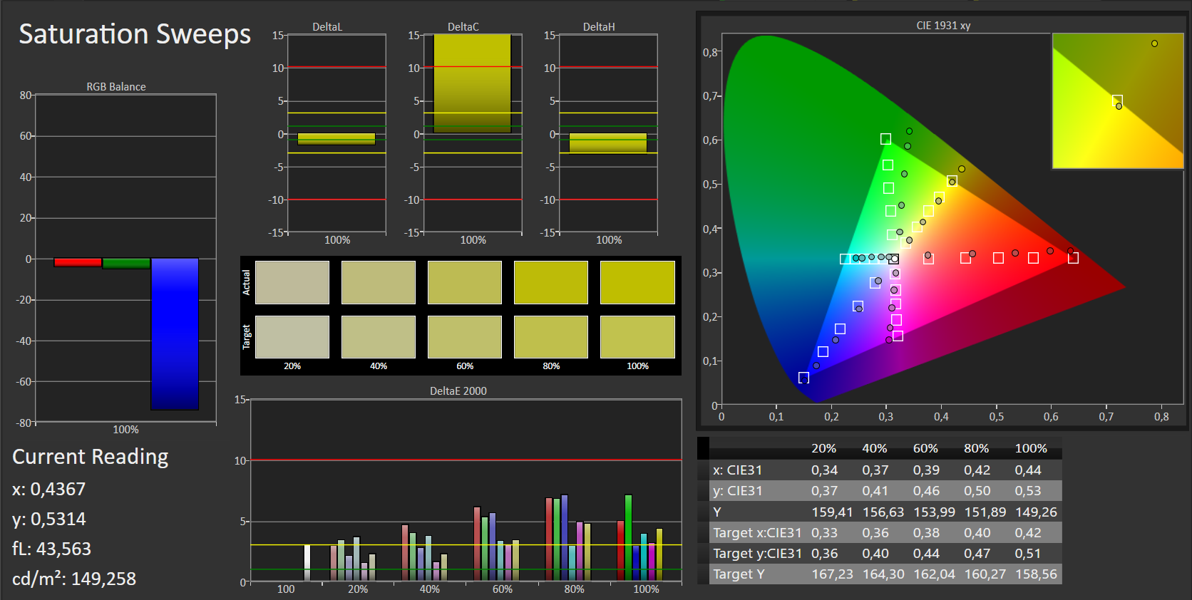 | Delta E Graustufen * | 3.91 | 6.28 -61% | 7.5 -92% | 9.83 -151% | 3.5 10% |