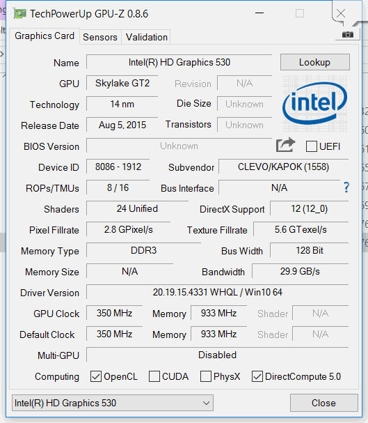 Für die Grafikausgabe ist die integrierte HD Graphics 530 des Prozessors zuständig. Der Kerntakt liegt bei maximal 950 MHz (Speicher 933 MHz). Die Takte können sich je nach Prozessor unterscheiden und maximal ist für die HD Graphics 530 ein Kerntakt von bis zu 1.150 MHz möglich. Die Leistung in den 3DMarks liegt je nach Test rund 10-30 % vor der HD Graphics 520 der mobilen ULV-Prozessoren, insgesamt bewegen wir uns hier aber dennoch auf einem niedrigen Leistungsniveau. Für alltägliche Aufgaben ist die GPU jedoch vollkommen ausreichend und dank der QuickSync-Technologie ist auch die Bearbeitung von Videos problemlos möglich. Weitere Benchmarks zur HD Graphics 530 sind in unserer Tech-Sektion verfügbar.