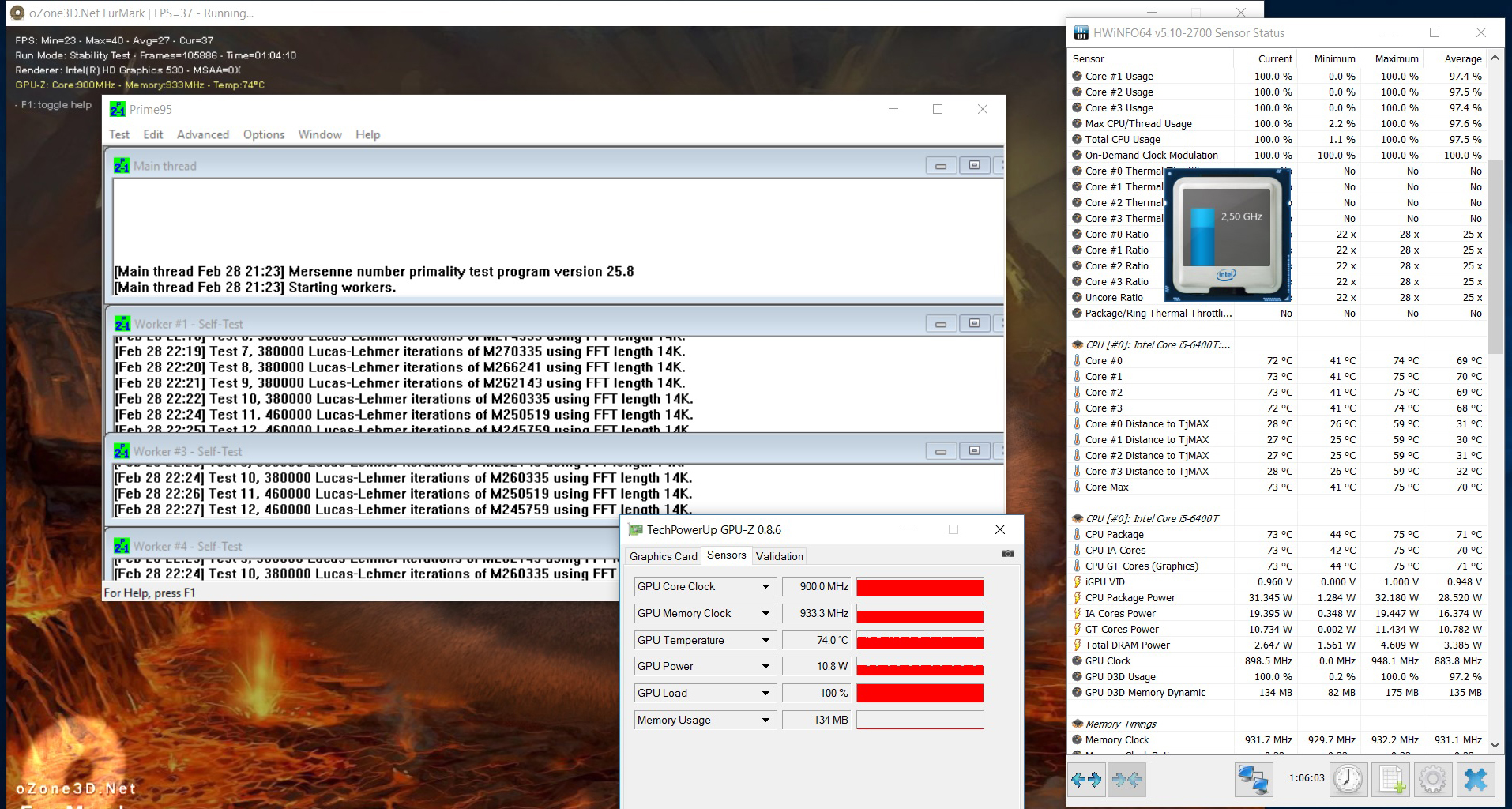 Den Stresstest (Prime95 und FurMark für mindestens eine Stunde) durchläuft unser Testgerät mit konstanten 2,5 GHz und damit dem maximalen Turbo für vier aktive Kerne. Die Grafikkarte läuft mit 900 MHz und erreicht damit nicht ihren maximalen Takt (950 MHz). Der Chip erwärmt sich dabei auf bis zu 75 °C. Ein 3DMark-11-Durchlauf direkt im Anschluss an den Stresstest zeigte erwartungsgemäß keine Leistungsreduzierung.