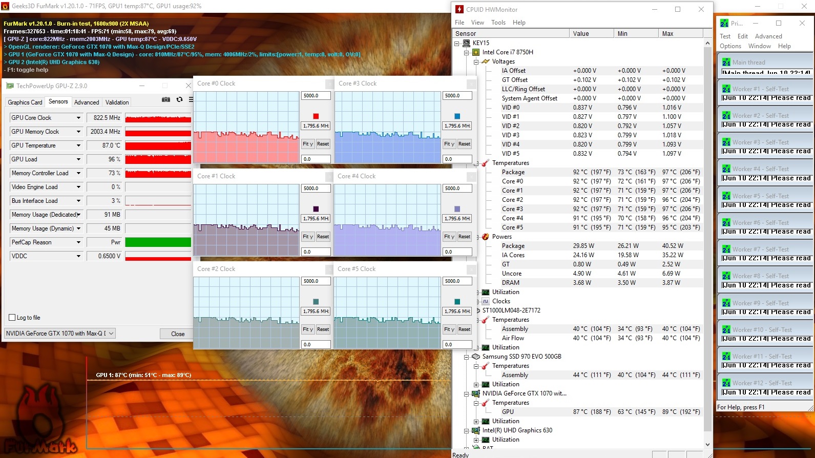 Noch heißer geht es bei den Komponenten zu. Nach 60 Minuten Volllast erzielten die GeForce GTX 1070 Max-Q und der Core i7-8750H rund 90 °C – und das, obwohl GPU und CPU unter ihren Basistakt fielen.